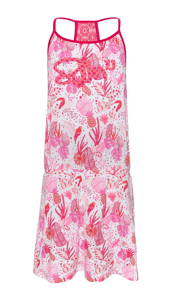 Lehoučké dívčí bavlněné šaty s nášivkou vpředu. Jsou z lehoučké bavlny. Vzadu mají krajkovou vsadku. Úžasný letní potisk s ptactvem.