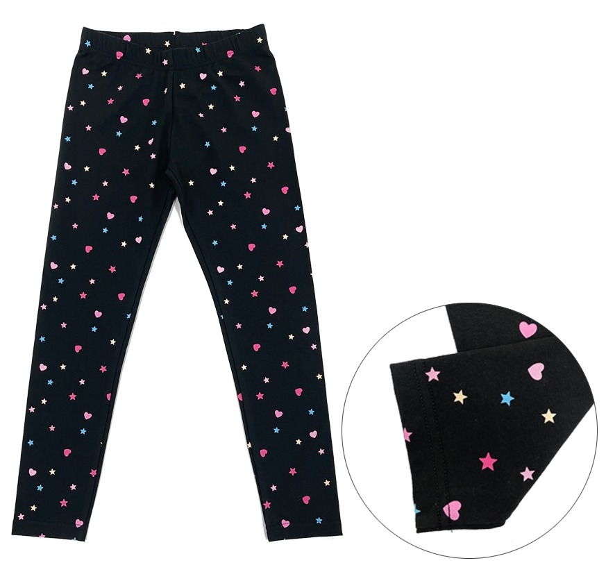 Dívčí úzké legíny s barevnými hvězdičkami a srdíčky rozzáří každou malou slečnu. Jedná se o slabší legínky, které hezky pruží, nemačkají se a rychle schnou. Využijete na kolo, běžné nošení i do školky.