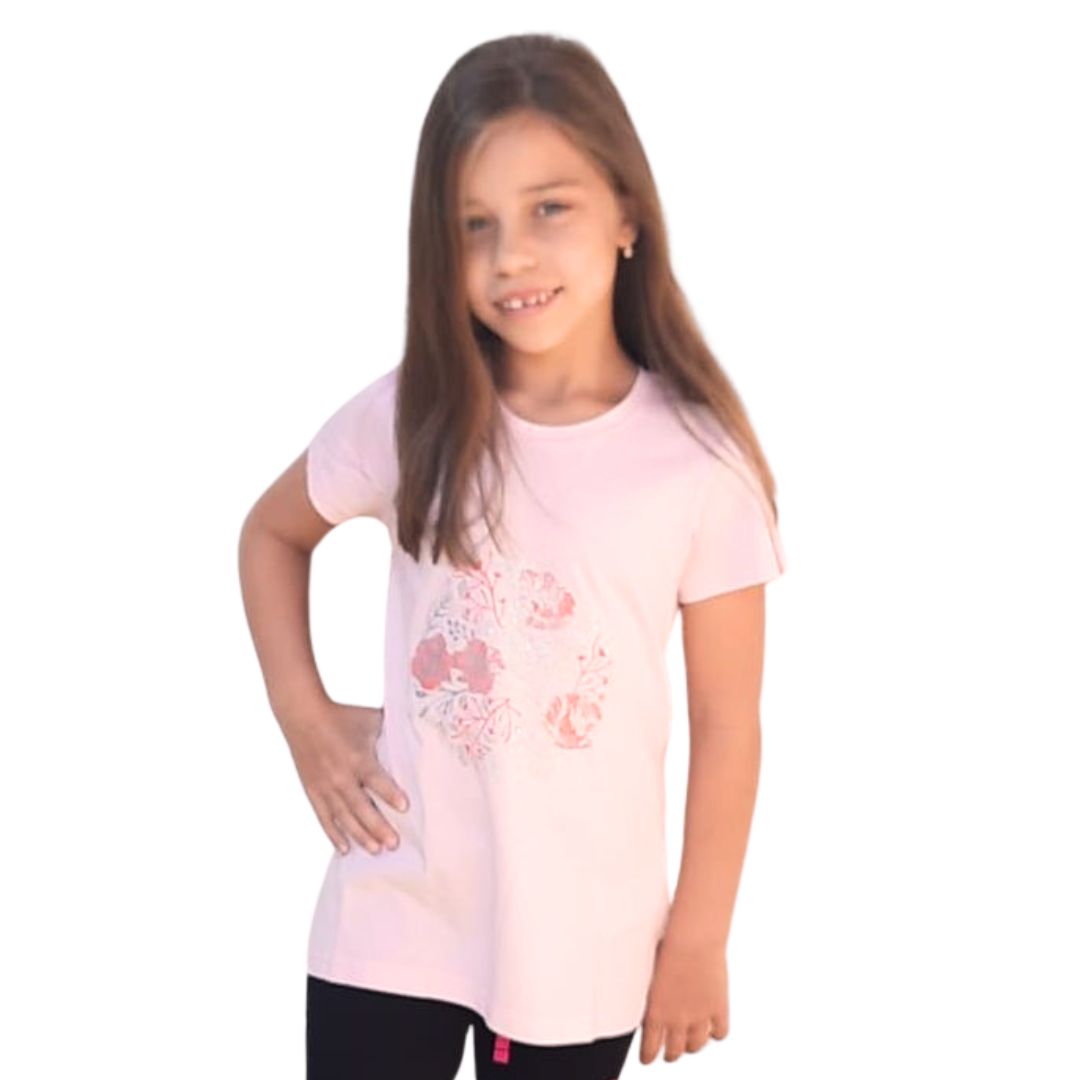 Krásné dívčí tričko s potiskem. Tričko má pohodlný volnější střih s kulatým výstřihem, rozšířeným spodním okrajem, prodlouženým zadním dílem.