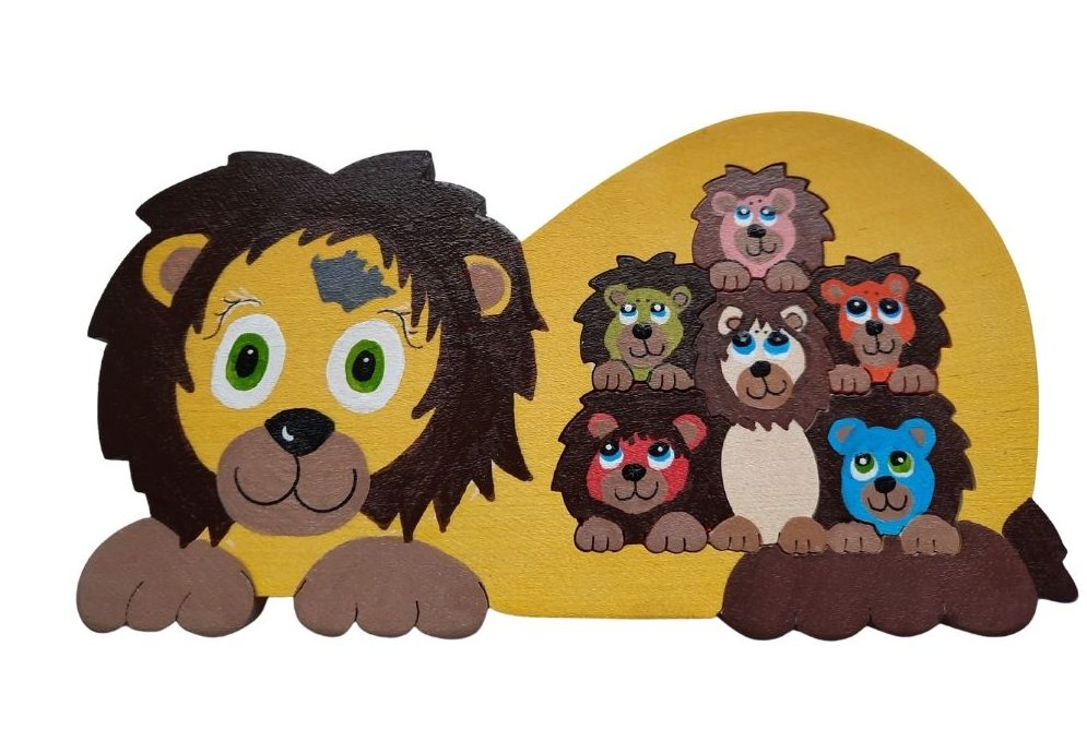 Dřevěná skládačka lvíček Tuláček s mláďaty - VÝPRODEJ